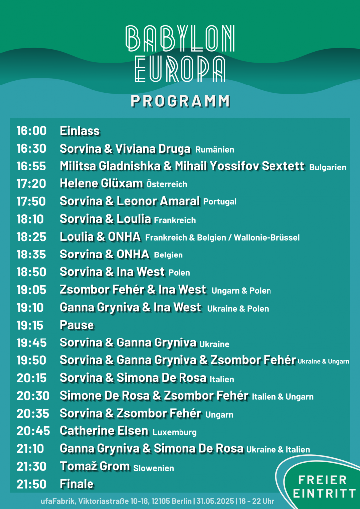 Die Kulturshow BABYLON EUROPA lässt auch in diesem Jahr wieder Musik, Tanz und zeitgenössische Performances aufeinandertreffen, um die Vielfalt und kulturelle Identität Europas zu feiern. Die siebte Edition von BABYLON EUROPA präsentiert am 31. Mai bei freiem Eintritt exzellente Künstler:innen aus 12 unterschiedlichen Regionen und Ländern Europas in der ufaFabrik in Berlin und beschließt damit zugleich den Berliner Europa-Monat Mai.