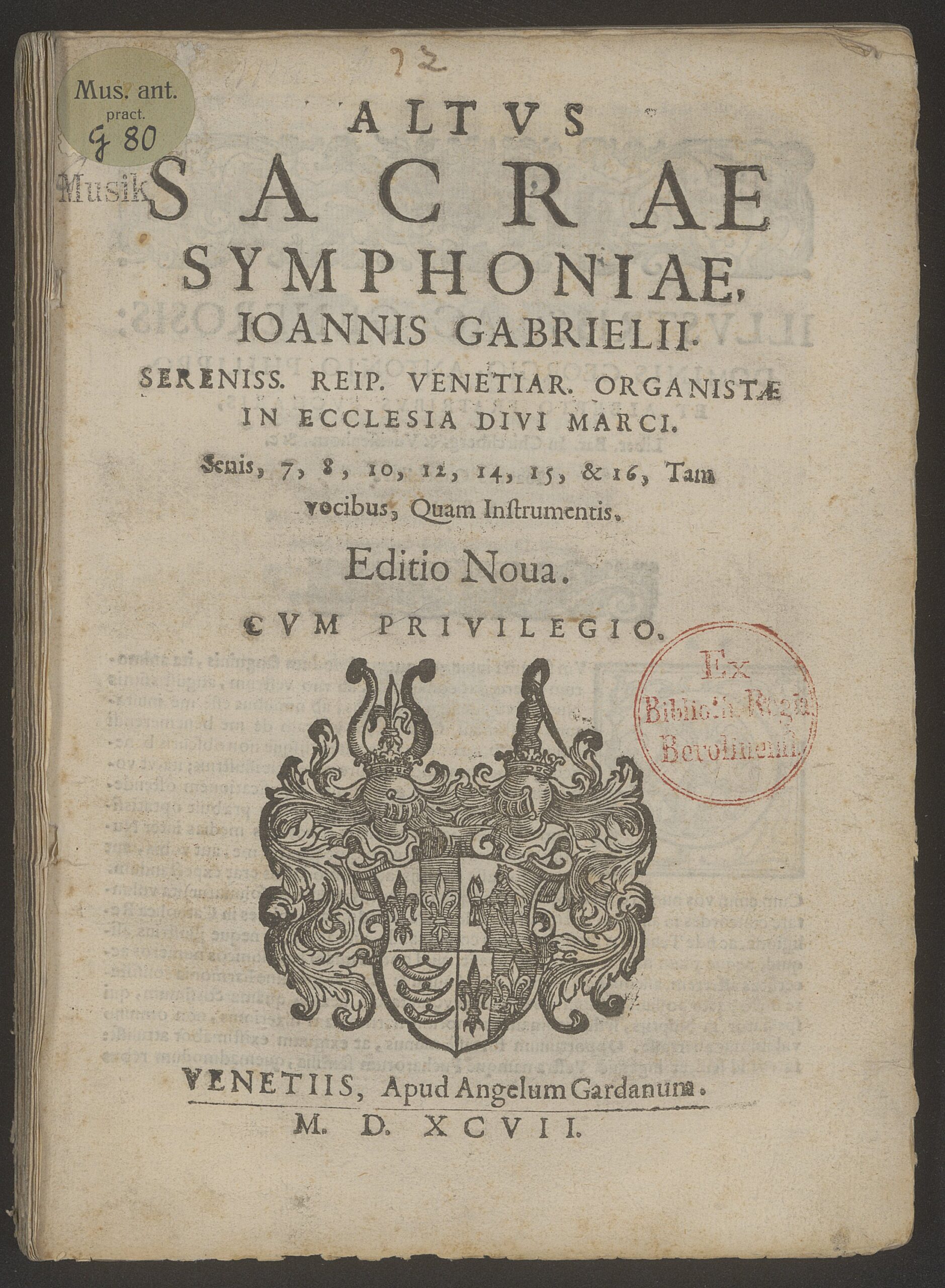 La publication, en 1597, des Sacrae Symphoniae de Gabrieli constitue une étape capitale dans l’histoire de la musique. Ce recueil de 62 pièces pour chœurs et ensembles instrumentaux marque le passage du monde ancien de la polyphonie a cappella rigoureuse à la nouvelle esthétique baroque de la musique concertante avec voix solistes, instruments obligés et basse continue. L’édition originale des Sacrae Symphoniae de Gabrieli se trouve à la Bibliothèque Jagellonne à Cracovie.