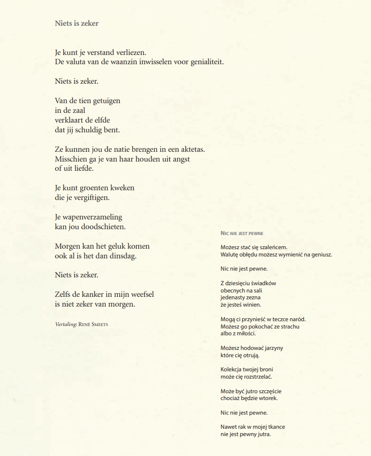 At the end, Leo Peeraer, publisher of Uitgeverij P., will present Ewa Lipska with the first copy of the new anthology. Afterward, Lipska will be signing her books.