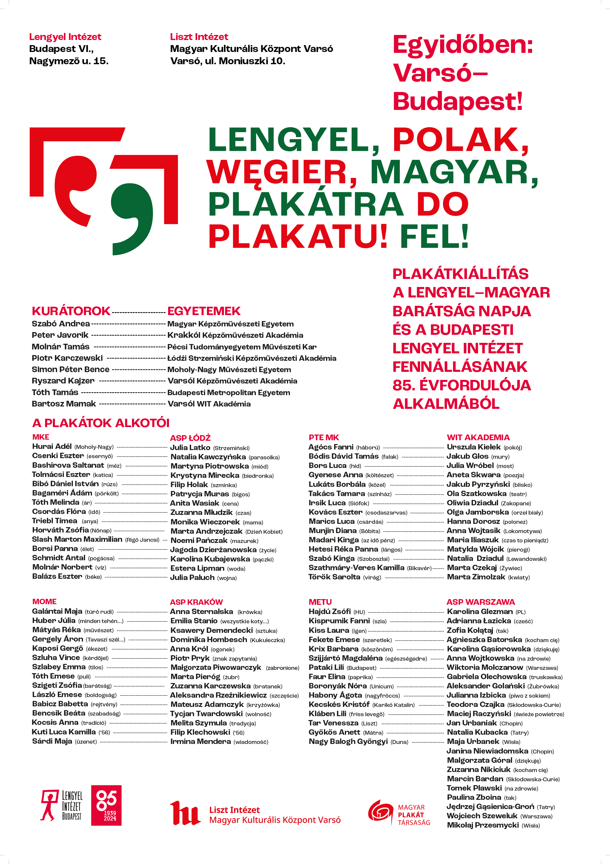 A 2024-ben 85. születésnapját ünneplő budapesti Lengyel Intézet és a varsói Liszt Intézet – Magyar Kulturális Központ a Lengyel-Magyar Barátság Napja alkalmából a Magyar Plakát Társaság társszervezésében együttes alkotómunkára és közös kiállítás létrehozására kérte fel a lengyel és magyar plakátművészek legfiatalabb nemzedékét.