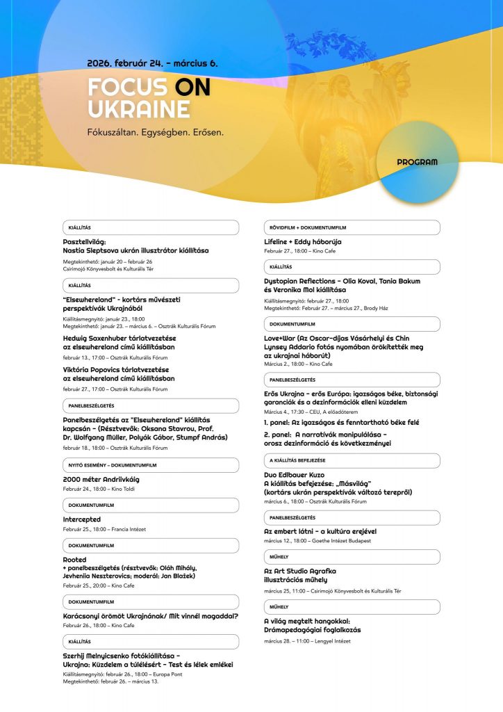 A #focusonukraine kulturális összefogás melynek szomorú apropója Oroszország Ukrajna elleni teljes körű agressziójának negyedik évfordulója. Az immár negyedik éve tartó háború iránt egyre nehezebb fenntartani a társadalmi figyelmet, a tisztánlátást és a szolidaritást. A Focus on Ukraine programsorozat erre a kihívásra válaszol azzal, hogy a napi híreken túlmutató nézőpontokat kínál: a személyes megéléseket, a kultúrát és a közös felelősséget állítja a középpontba filmeken, kiállításokon, irodalmi programokon és szakmai beszélgetéseken keresztül. Az esemény idén második alkalommal valósul meg tizenhárom európai kulturális intézet és nagykövetség nagyszabású együttműködésében.