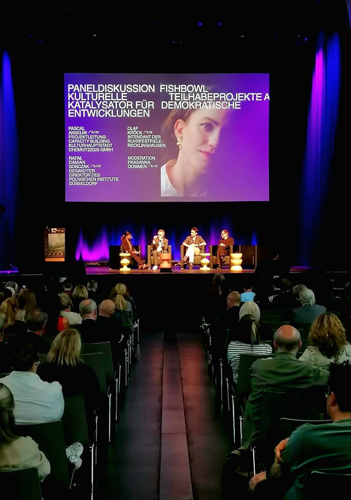 Radca Minister Rafał Sobczak wziął udział w głównej dyskusji panelowej konferencji „Kulturelle Teilhabeprojekte als Katalysator für demokratische Entwicklung“ / „Projekty partycypacji kulturowej jako katalizator rozwoju demokratycznego.” W rozmowie z Olafem Kröckiem (dyrektorem Ruhrfestspiele Recklinghausen), Pascalem Anselmim (kierownikiem projektu Capacity Building Kulturhauptstadt Chemnitz2025 GmbH) i Prasanną Oomen, która moderowała panel, omówiono aspekty polityki kulturalnej w Zagłębiu Ruhry i w Polsce, takie jak dialog i różnorodność, partycypacja poprzez projekty artystyczne i zabezpieczenie finansowe w sektorze kultury. Ważnym punktem dyskusji było także znaczenie społeczności miejskiej w kontekście antydemokratycznych tendencji.