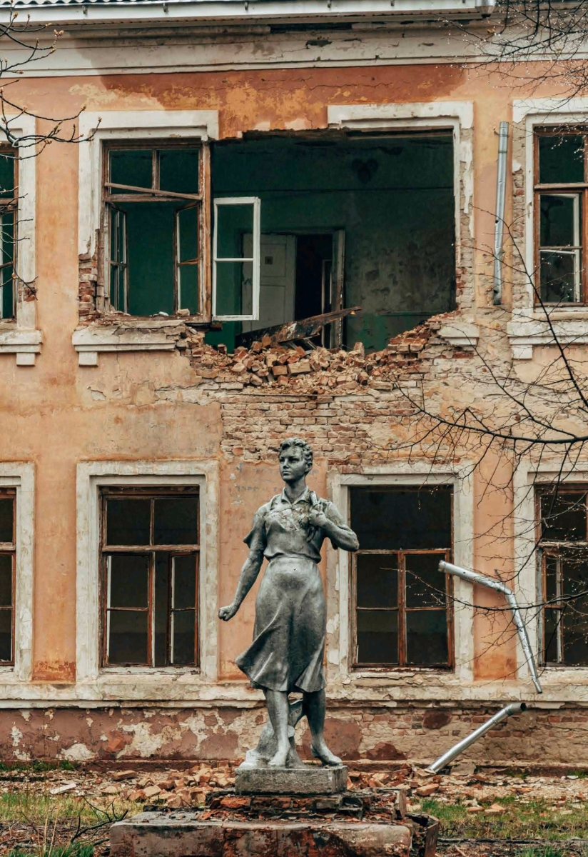 - Statue im Innenhof einer zerstörten Schule