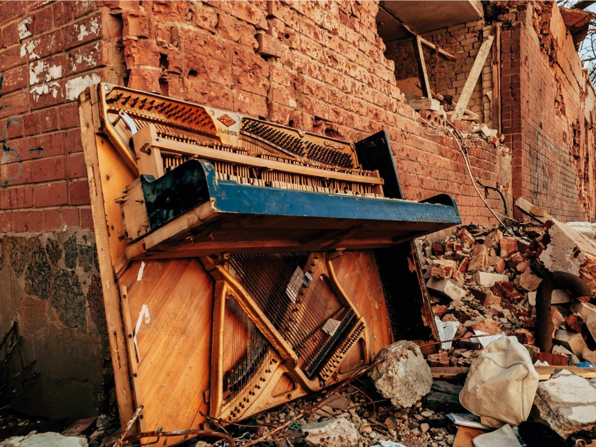 - Überreste eines Klaviers in Ruinen