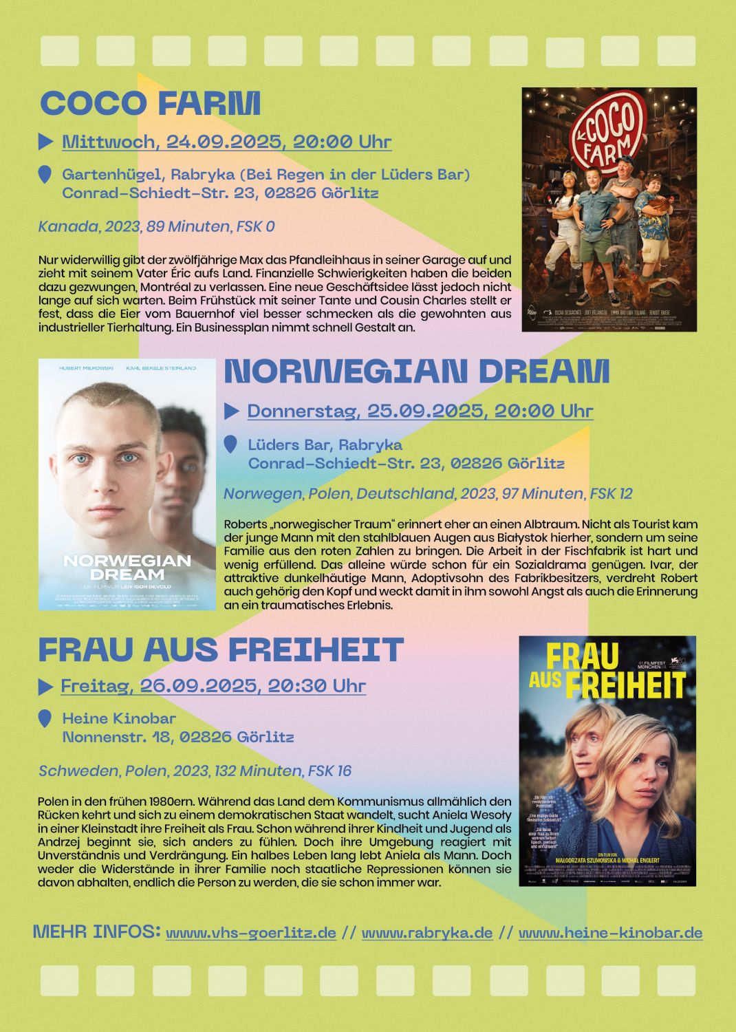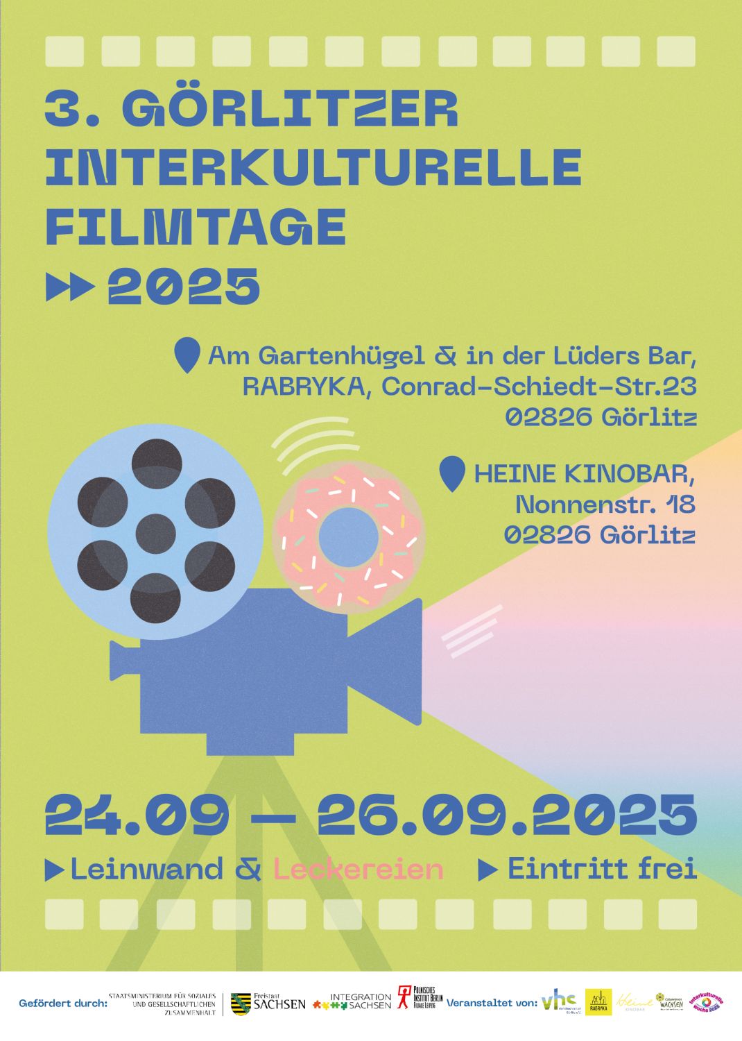 Das Projekt „Görlitzer Interkulturelle Filmtage“, das 2023 von der Volkshochschule Görlitz ins Leben gerufen wurde, hat sich als fester Bestandteil des interkulturellen und filmkulturellen Lebens in Görlitz etabliert. Ziel des Projekts ist es, durch internationale Filmkunst den Austausch zwischen Menschen unterschiedlicher Herkunft zu fördern, Empathie zu stärken und vielfältige gesellschaftliche Perspektiven sichtbar zu machen. Die Filmtage 2025 präsentieren ein sorgfältig kuratiertes Programm aus Filmen, die an unterschiedlichen Abenden und Veranstaltungsorten gezeigt werden. Das Projekt richtet sich an Zugewanderte ebenso wie an die gesamte interessierte Stadtgesellschaft – unabhängig von Alter, Herkunft oder Vorwissen. Die Filme stammen aus verschiedenen Ländern Europas und Afrikas und greifen relevante Themen wie Umweltschutz, Migration, Identität und Gleichberechtigung auf. Ein besonderes Highlight jedes Filmabends sind Kuchen aus verschiedenen Ländern, die von Kursteilnehmerinnen der vhs Görlitz gebacken werden.