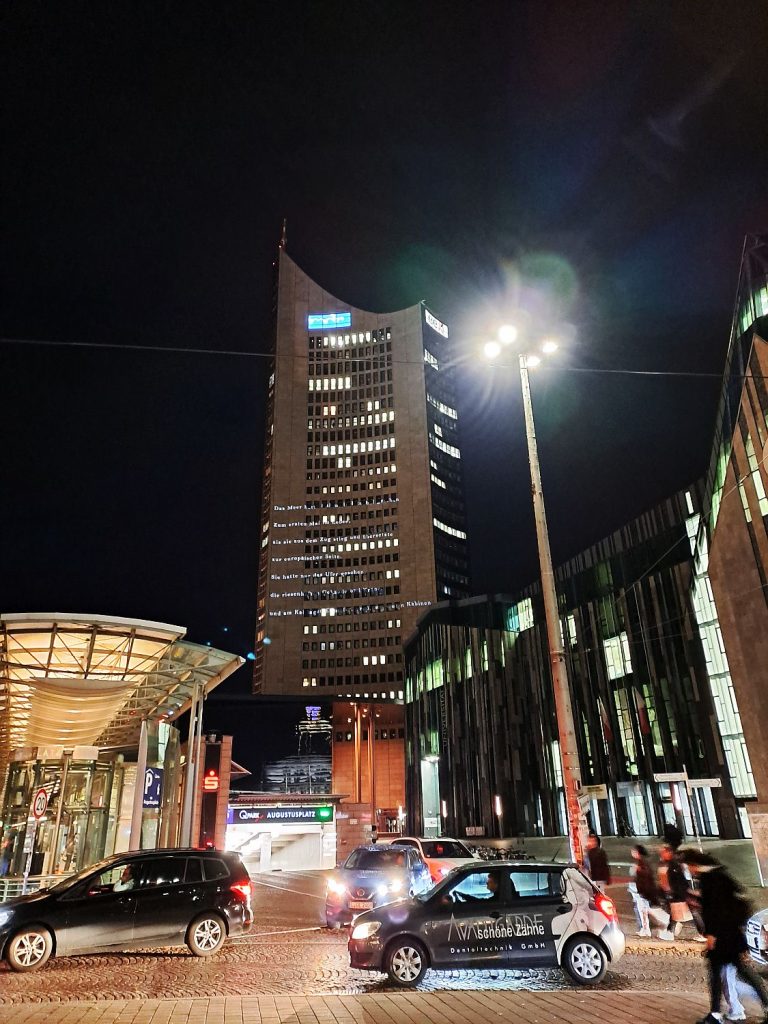 Zwischen dem 3. und 9. November 2025 verwandelt sich der Leipziger „Uniriese“ abends in ein monumentales Wortkunstwerk. Unter dem Titel „Lichtw:orte. Leipziger Lichtlyrik“ präsentiert das Projekt visuell aufbereitete und dramaturgisch inszenierte Gedichtausschnitte als Lichtinstallation im öffentlichen Raum, die das Thema „Flucht und Zuflucht“ fokussieren.