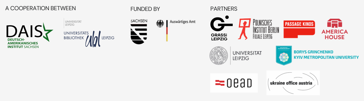 Veranstalter der 3. Ukrainian Week Leipzig 2026: Deutsch-Amerikanisches Institut Sachsen und Universitätsbibliothek Leipzig in Kooperation mit: GRASSI Museum für Völkerkunde zu Leipzig, Polnisches Institut Berlin – Filiale Leipzig, Passage Kinos Leipzig, America House Lviv, Universität Leipzig & Borys Grinchenko Kyiv University, ermöglicht durch die Förderung des Auswärtigen Amtes und des Freistaates Sachsen
