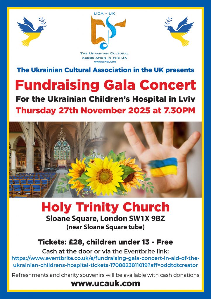 Featuring the Liudkevych String Orchestra of London conducted by Bogdan Skrypka and six accomplished clasical musicians who will play works by Mozart, Puccini, Lysenko, Barvinsky and Alla Sirenko (co-founder of the Ukrainian Cultural Assocation)