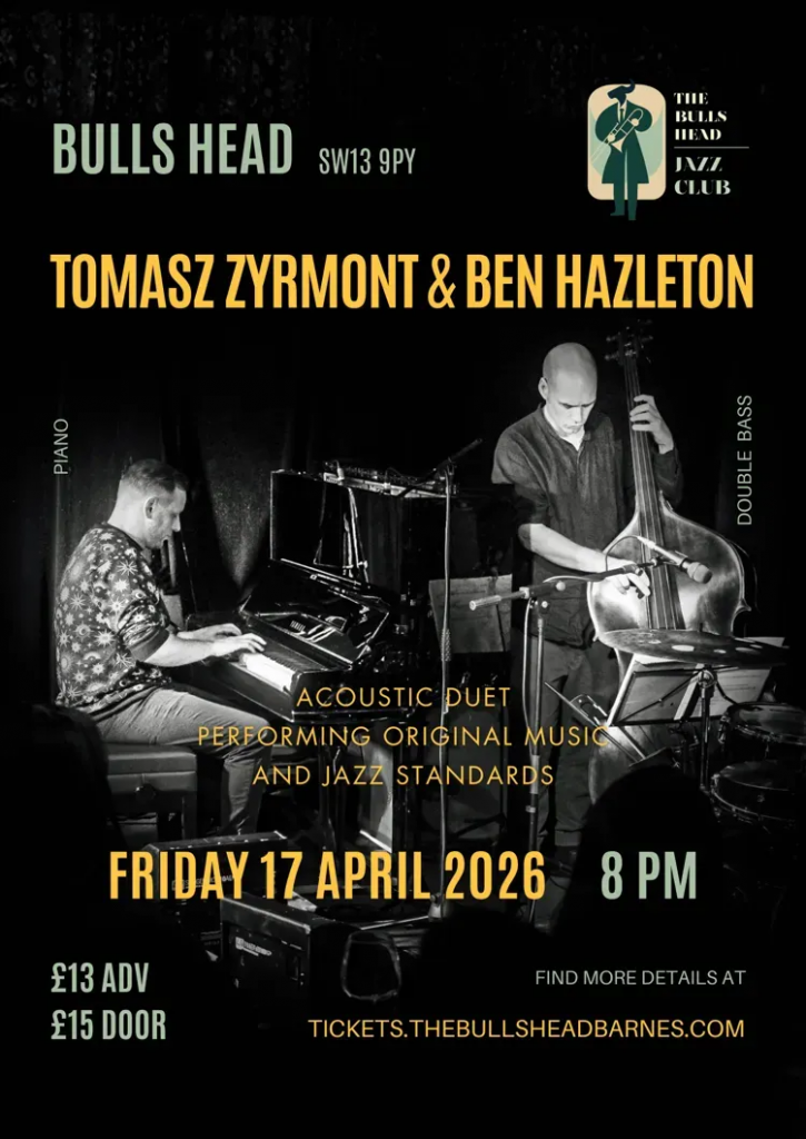 Having collaborated in a variety of settings – including performances at The 606 Club and appearances at the London Jazz Festival – Zyrmont and Hazleton share a strong musical rapport. Their performances at the Bulls Head have been particularly well received, and they are also scheduled to perform in Poland this May with Zyrmont’s quartet.