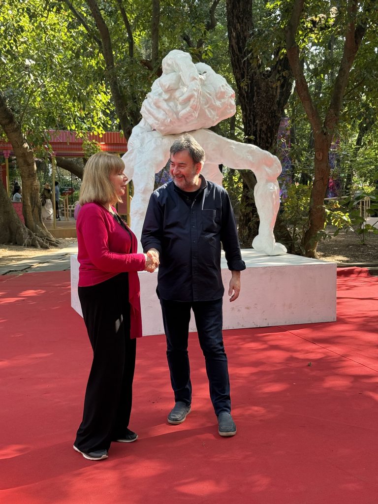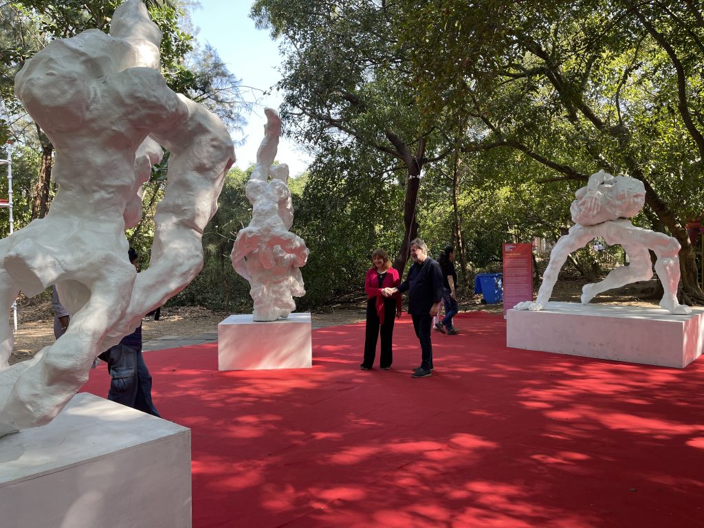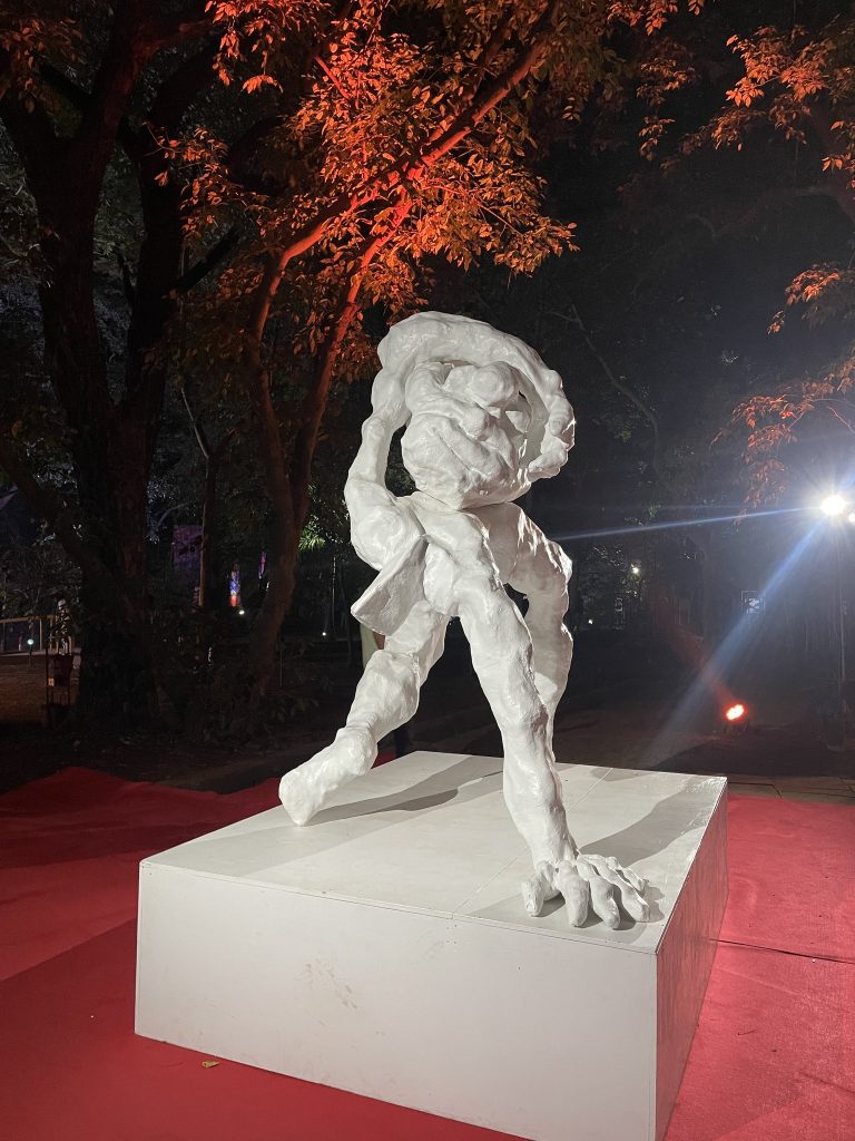 Installed in the open-air setting of the Art Park in Goa, the exhibition features three monumental white sculptures crafted in polyester resin. The works depict human figures in close interaction with oversized heads—an evocative visual metaphor for intellect, consciousness, memory, and spirituality. These exaggerated heads appear not as burdens but as focal points of reflection, suggesting a state of suspension between the physical body and the immaterial realm of thought and spirit.