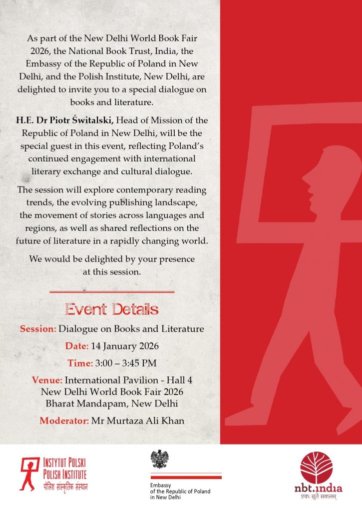 We are delighted to invite you to a special dialogue on books and literature being organised as part of the New Delhi World Book Fair 2026 by the National Book Trust, India, in collaboration with the Embassy of the Republic of Poland in New Delhi and the Polish Institute New Delhi.