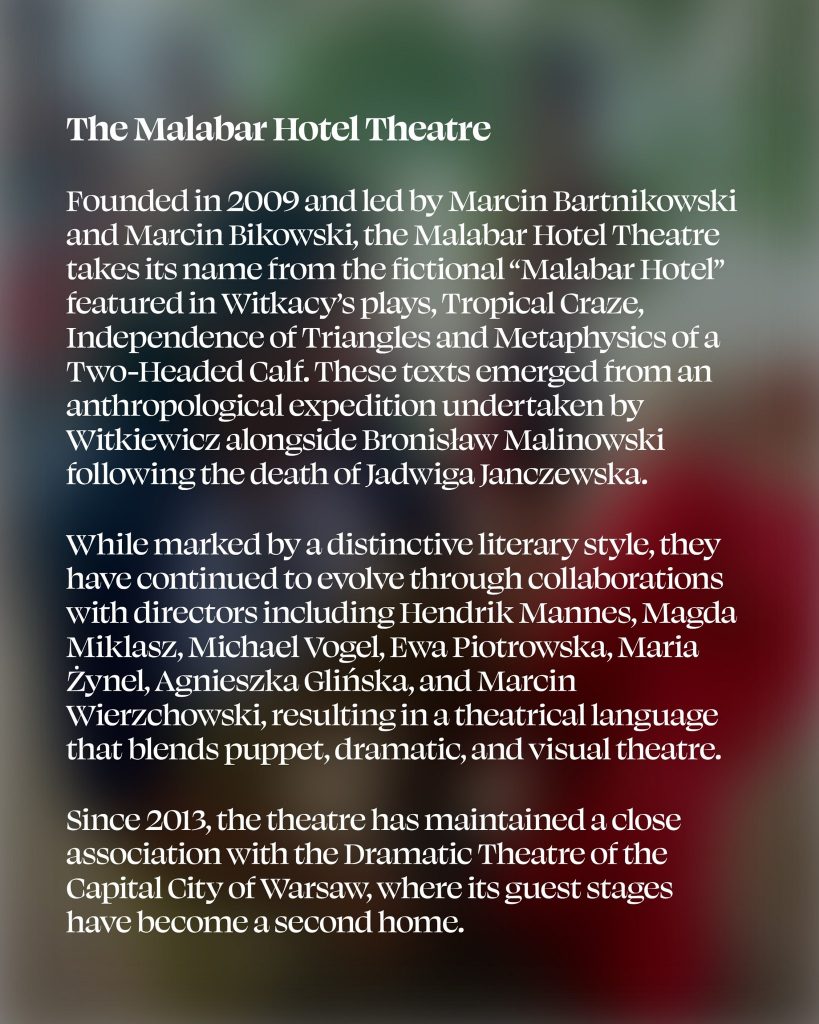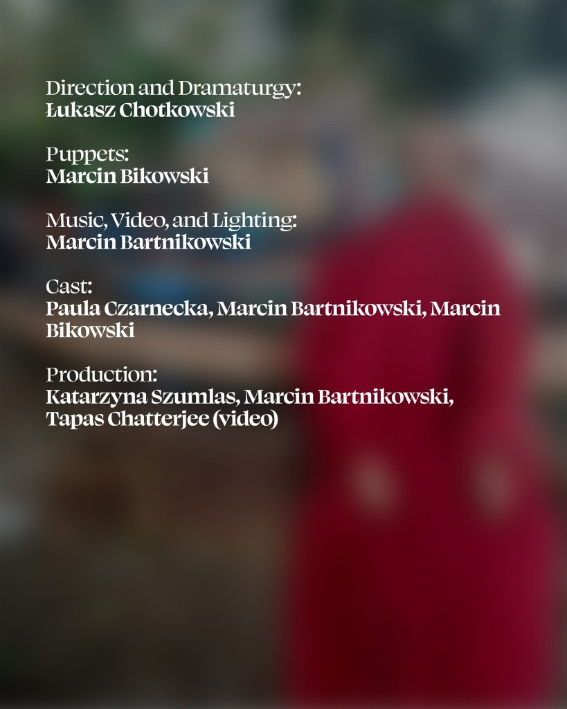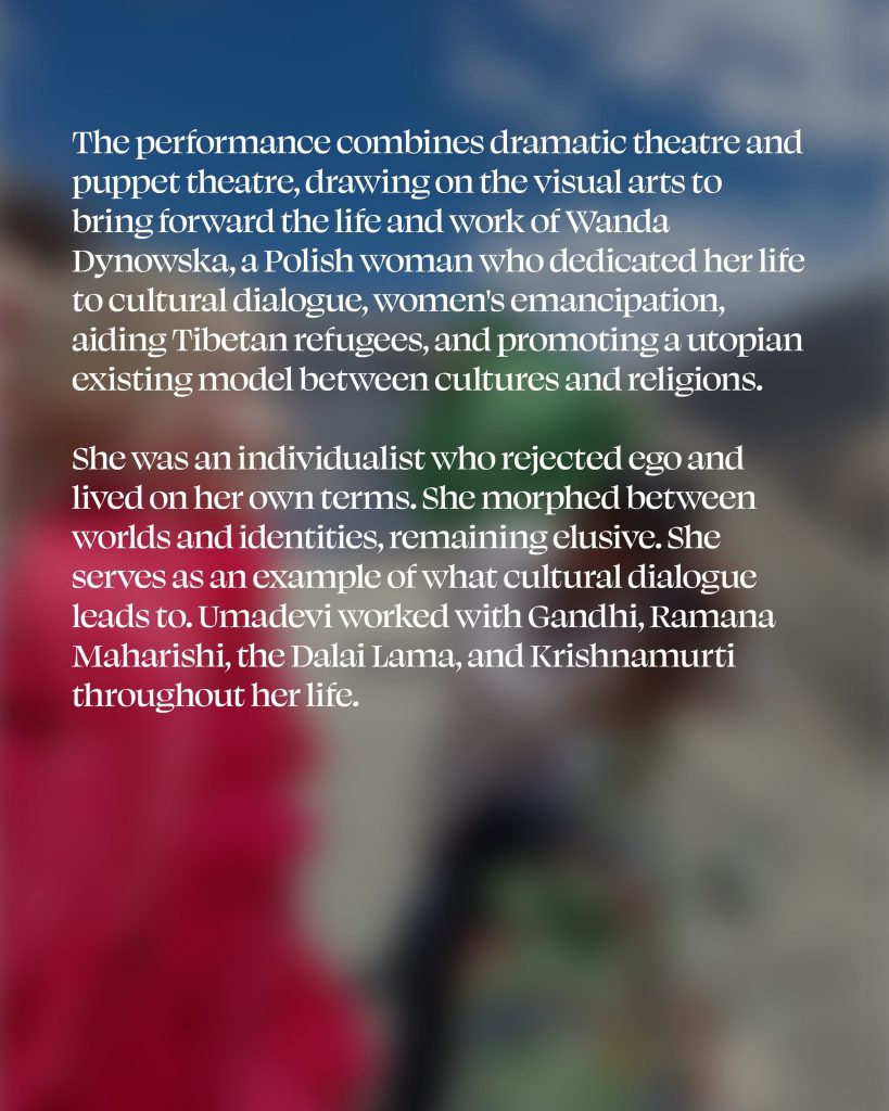 Combining dramatic theatre and puppet theatre with visual arts, the performance brings to life the extraordinary journey of Wanda Dynowska, a Polish visionary who dedicated her life to cultural dialogue, women’s emancipation, support for Tibetan refugees, and fostering harmonious exchange between cultures and religions. An individualist who transcended worlds and identities, she collaborated with Gandhi, Ramana Maharishi, the Dalai Lama, and Krishnamurti, exemplifying the transformative power of cultural dialogue.