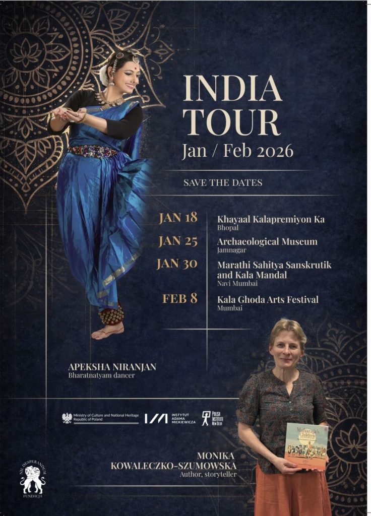 Inspired by this chapter of history, writer Monika Kowaleczko-Szumowska and dancer of Polish descent Apeksha Niranjan created a unique stage dialogue exploring the similarities and differences between Polish and Indian cultures, traditions, and values. Through storytelling and Bharatanatyam dance, the performance reflected on resilience, identity, displacement, and gratitude. Apeksha’s choreographies drew from Polish heritage, including the legend of the Warsaw Mermaid and the life of Maria Curie Sklodowska alongside a moving tribute to the Polish child refugees sheltered in India.