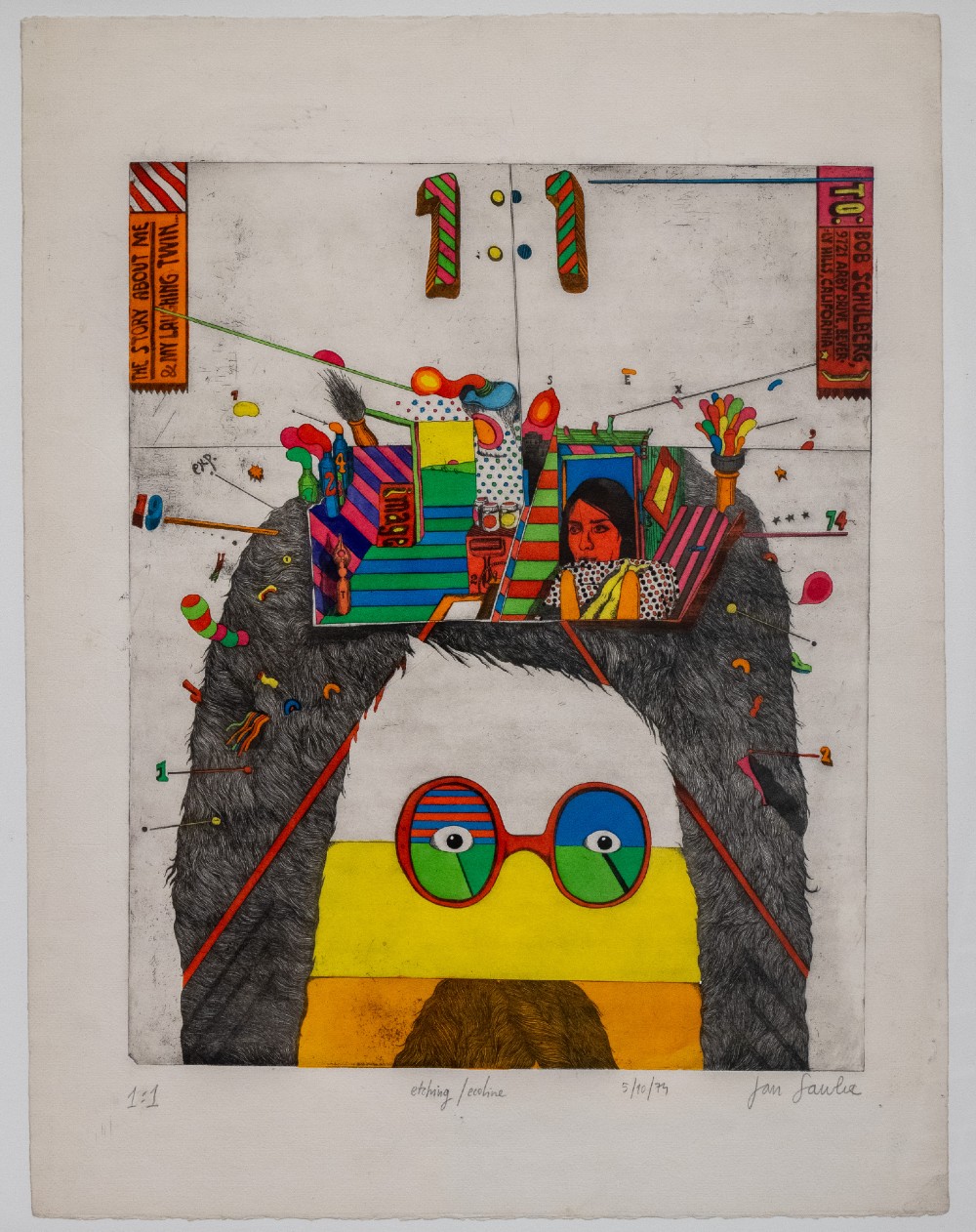 - © The Story of Me and My Laughing Twin, 1979. Hand-colored aquaforte print, 25 x 19 in. Photo courtesy of RAFFMA