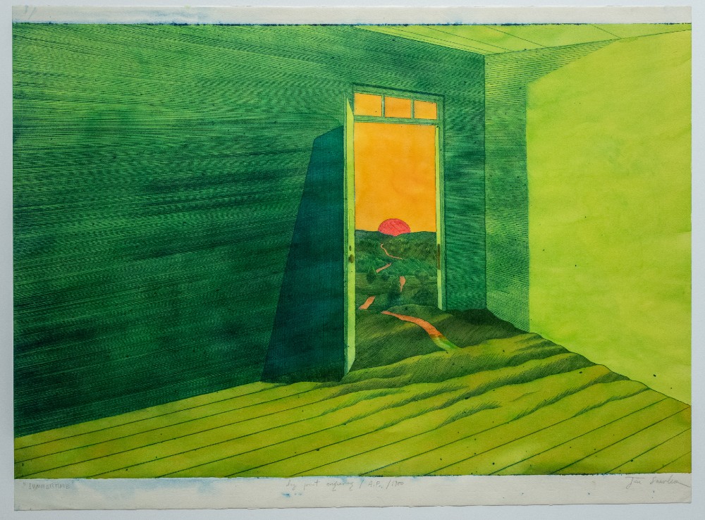 - © Summertime , 1980. Hand-colored drypoint print, 19 x 25 in. Photo courtesy RAFFMA