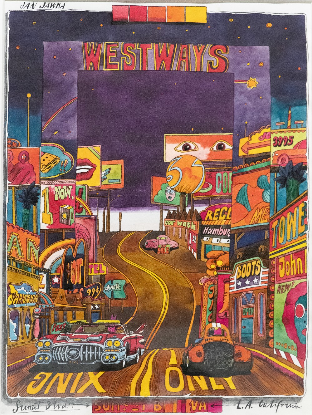 - © Sunset Boulevard (Westways Cover Art), 1978. Watercolor pencils and watercolors on paper. 17 x 11 in. Photo courtesy of the Automobile Club of Southern California Archive
