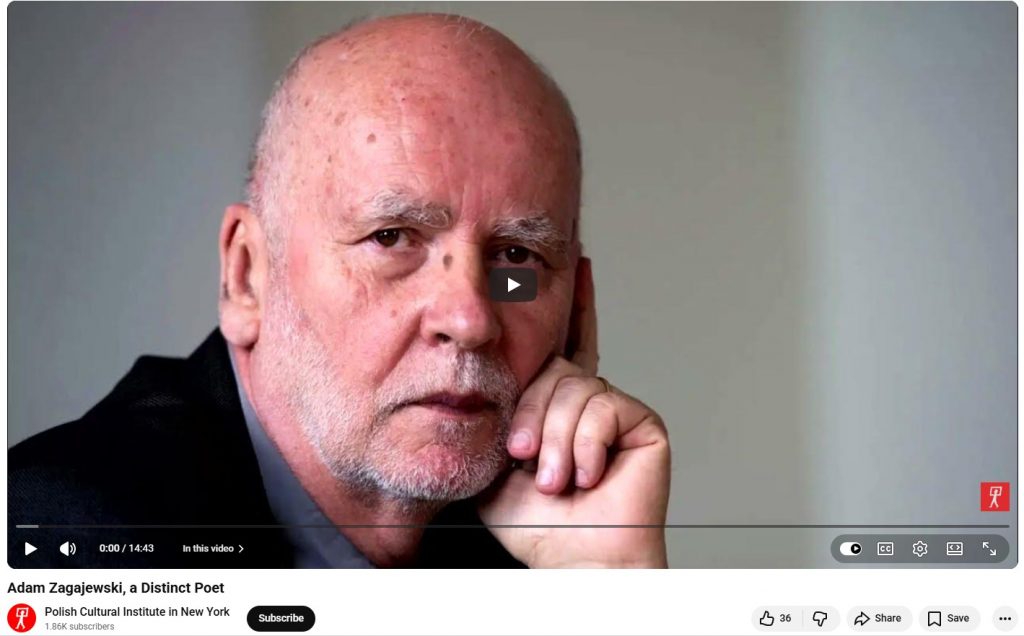 “Adam Zagajewski’s poems put us in the presence of great mysteries. They deliver us to something that’s deep and strange and perhaps even unlimited within ourselves. They have a certain kinship to prayer, a paradoxical feeling for truth, a fiery sense of quest and a keen longing for luminosity,” says Edward Hirsch in the beginning of the video. ”…Adam’s poems are everywhere shadowed by death, he’s highly aware of the cruelty in the world, of historical forces that dominate so much of history through cruelty and violence. He was born in Lwów, now Lviv, which [then] was part of Poland. His family was displaced by the Soviet invasion which threw out the Germans and then took over Poland. His family suffered under two totalitarianisms. He moved to Kraków to go to school, studied philosophy and became a poet.