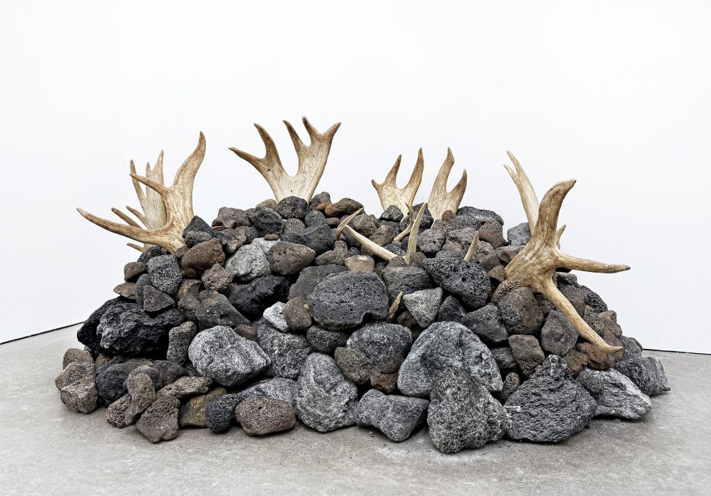Lead image: Jan Baracz, DARK DIAL, 2024. 35 x 20 inches x 22 inches. Oil drum lid, surfboard fin, assorted car tires.