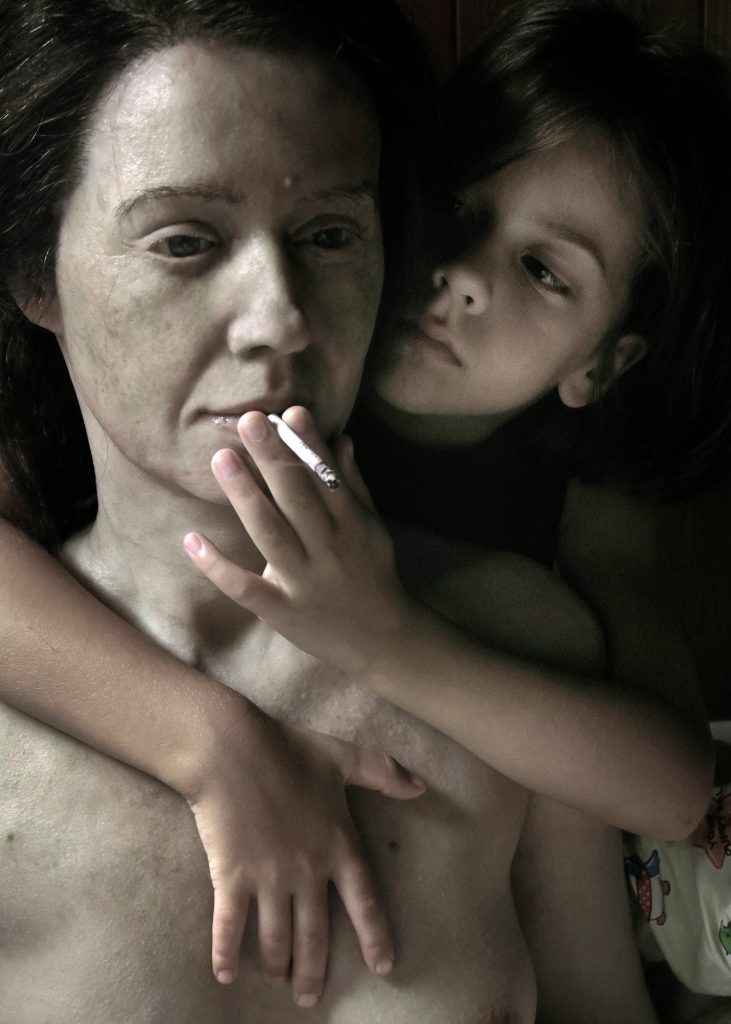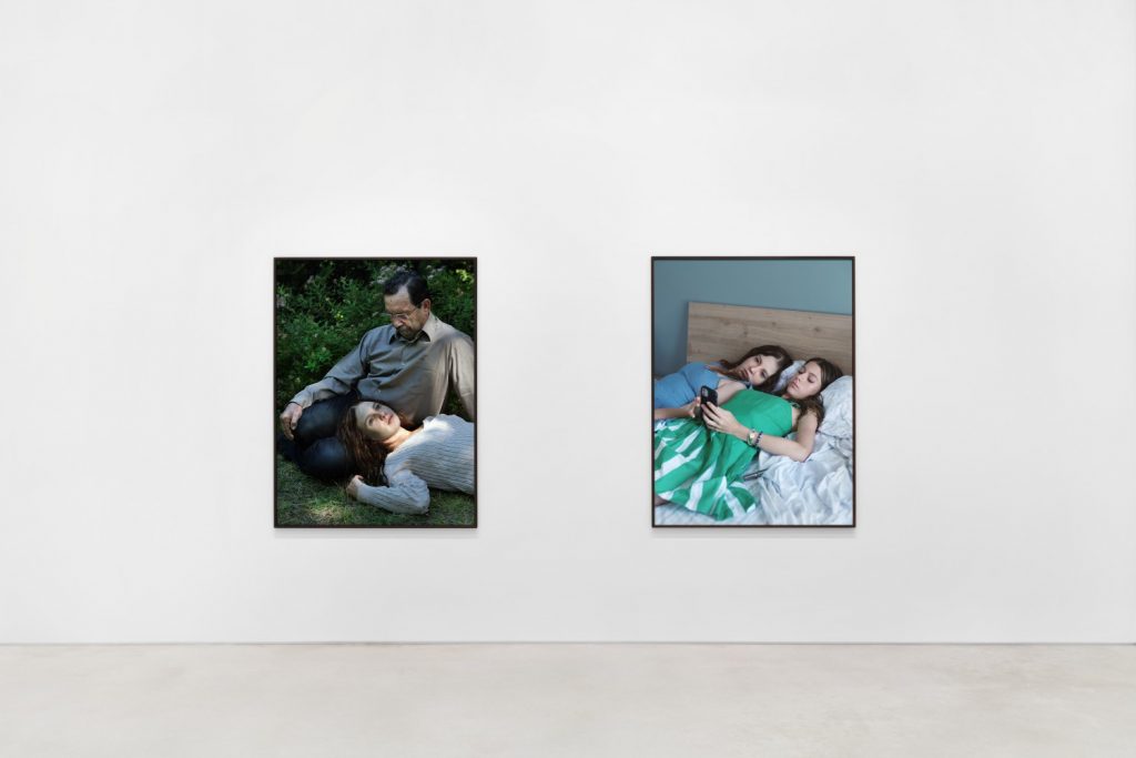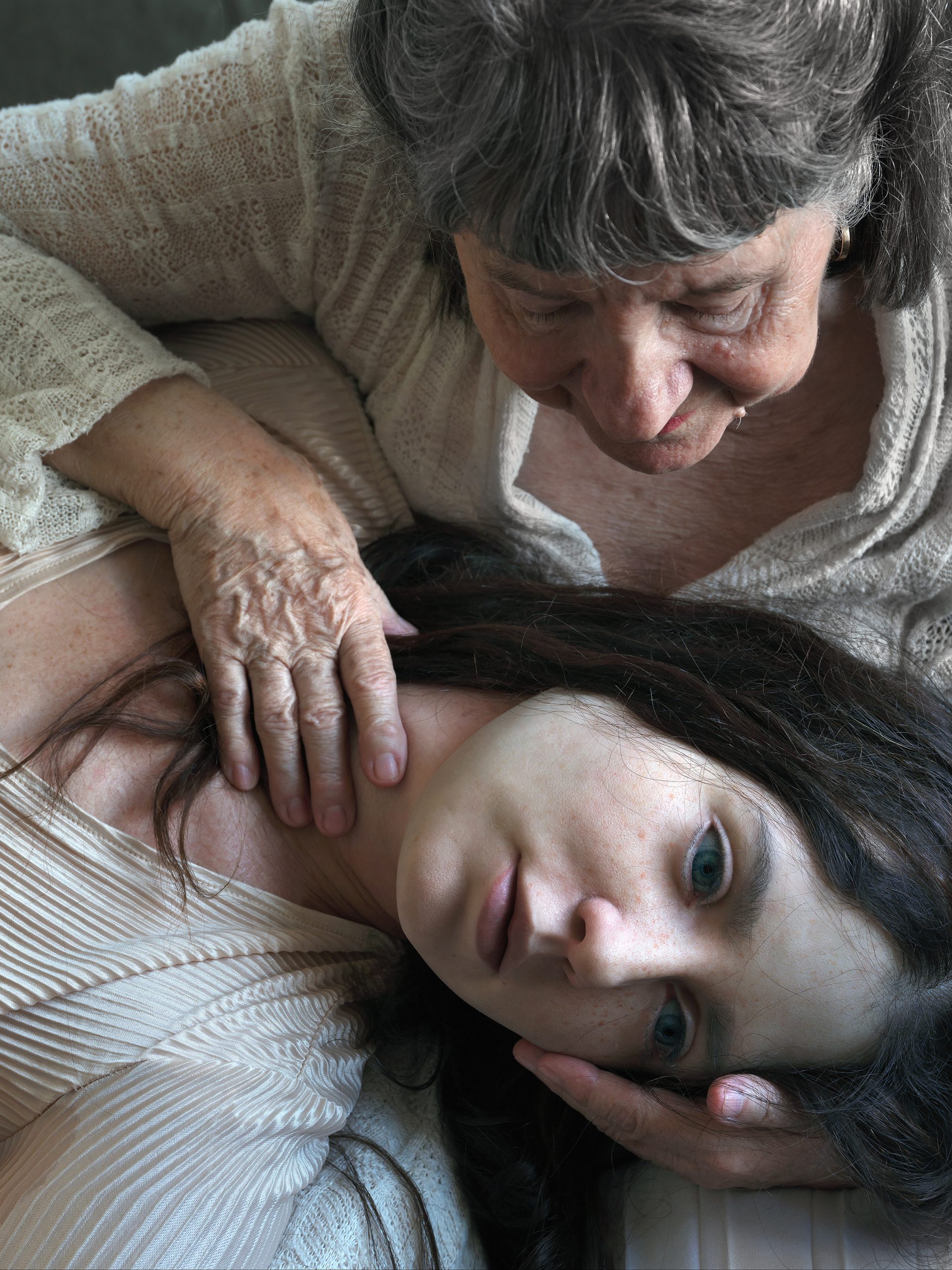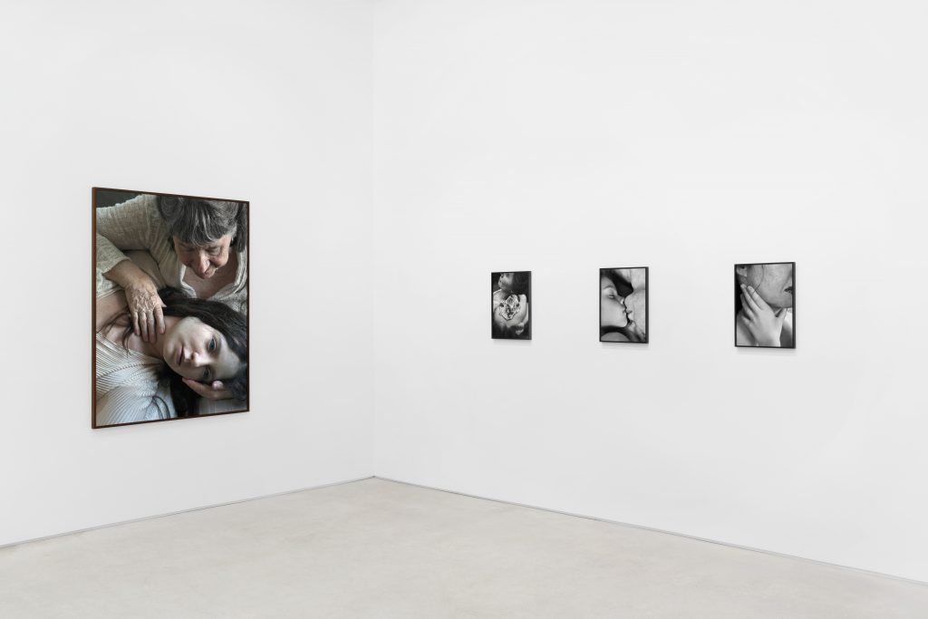 The exhibition further features Mama (2018), a hyperrealistic silicone replica of the artist, created with professional fabricators. Photographed alongside her daughter in a range of constructed situations, the figure functions simultaneously as surrogate and object, raising questions about representation, identity, and the unstable boundary between person and image.