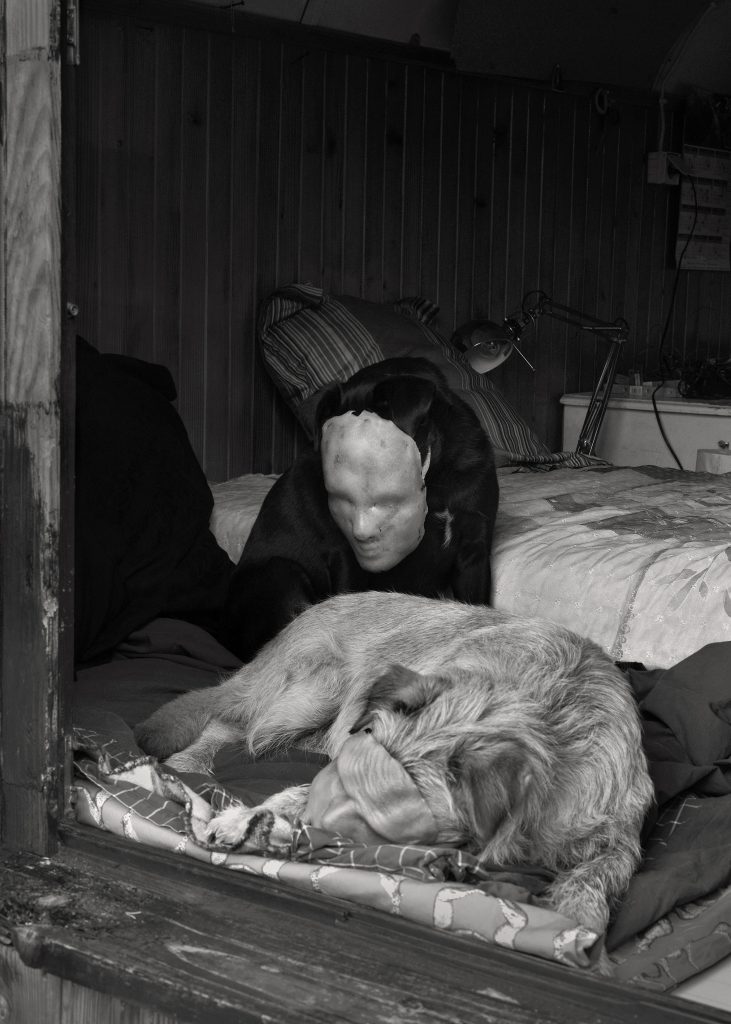 Also included is Domestic Animals (2022), where pigskin masks of the artist’s face are fitted onto her dogs. The photographs produced from these interventions examine ideas of recognition, projection, and estrangement.