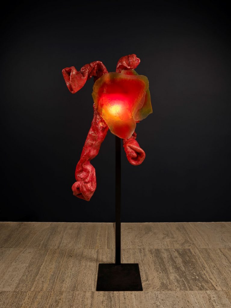 Alina Szapocznikow (b. 1926, Kalisz, Poland; d. 1973, Passy, France), a Holocaust survivor, is celebrated for sculptures that confront the vulnerability and ephemerality of the human body, including Kaprys – Monstre (1967), which uses casts of body parts, resin, and lighting to create a fragile, grotesque, and ambiguous figure reflecting both the horrors and transcendence of embodied experience.