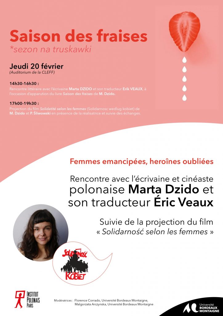 - 20 février – rencontre en compagnie d’Erik Veaux et de Małgorzata Arczynska à l’université de Bordeaux, suivi d’une projection du film « Solidarité selon les Femmes » (Solidarność według kobiet).