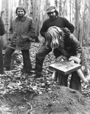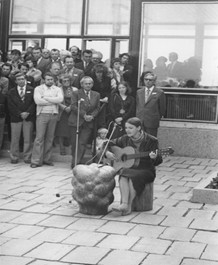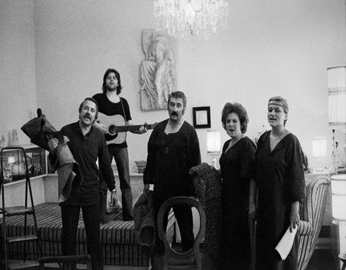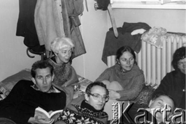 Vernissage of the unauthorized sculpture exhibition Meeting of Science and Art in May 1980. Zuzana Homolová plays the guitar and sings, behind her stands the curator of the exhibition, critic, and art historian Zuzana Bartošová, who organized a number of exhibitions of artists from the independent scene in the 1970s and 1980s. Source: Private archive of Z. Bartošová, photo by František EngelWomen helped shape Slovakia’s diverse alternative art scene: banned visual artist and performer Jana Želibská organized her own happenings and land art works. Ilona Németh, involved in anti-regime activities of the Hungarian minority, participated in the first festival of alternative, experimental, and multimedia art in 1988. The photo shows the burying of a box containing works by independent artists, including Jana Želibská, „for future generations“ on February 24, 1975, near Bratislava. Source: Private archive of Z. Bartošová, photo by Martin LičkoEwa Dałkowska was the co-organizer of Teatr Domowy, a residential theater, which presented plays by Václav Havel, among others, in private apartments during the state of emergency. The photo shows Ewa Dałkowska and Wojciech Pszoniak during a performance in 1977. Source: Archive of Ośrodek KARTA, photo by Jarosław TarańKyra Matuštík, one of the few Slovak signatories of Charter 77, co-organized independent cultural events. Together with friends from the Prague underground, they tore down Soviet flags and put up anti-regime stickers around the city. Source: Private archive of K. MatuštíkAfter being banned from public performances, actress Vlasta Chramostová organized theater performances in her apartment, involving other artists who had also been excluded from official cultural life. The photo shows the legendary play The Macbeth Play from 1978. From left: its author Pavel Kohout, singer-songwriter Vlastimil Třešňák, Pavel Landovský, Vlasta Chramostová, and Tereza Boučková. Source: Library of Václav Havel, photo by Oldřich ŠkáchaActress Halina Mikołajska was an important figure in Poland’s independent culture. She co-organized uncensored theater performances and participated in hunger strikes, protests, and demonstrations. The photo shows a hunger strike by members of KOR in the Church of the Holy Cross for imprisoned Czechoslovak Charter signatories in October 1979. In the front row, from left: Andrzej Czuma, Jan Lityński, and Jerzy Markuszewski; in the second row, from left: Halina Mikołajska, Joanna Gwiazda, and Anka Kowalska.