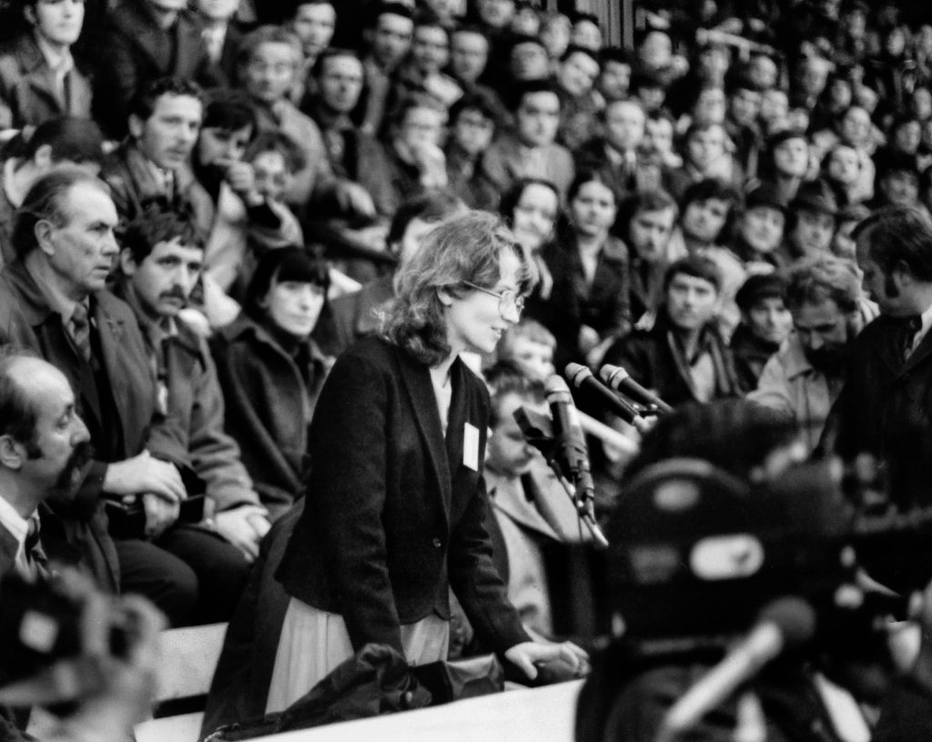 During the August strikes at the Gdańsk shipyards, Alina Pienkowska convinced the workers that they must not agree to the initial agreements and must continue their protests in solidarity with other companies. The photo shows her speaking at the Solidarity congress in Nowy Targ on October 19, 1980.