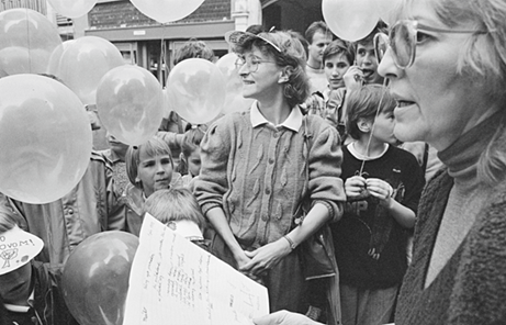 On June 1, 1989, Mária Filková (first from the right in the photo) co-organized a march of mothers with children in front of Bratislava City Hall with Zora Pauliniová. The children wrote and signed a letter, which they handed over to the mayor, expressing their dissatisfaction with the state of the environment in Bratislava. Filková was later the only woman on the Coordinating Committee of the opposition civic political movement Public Against Violence.