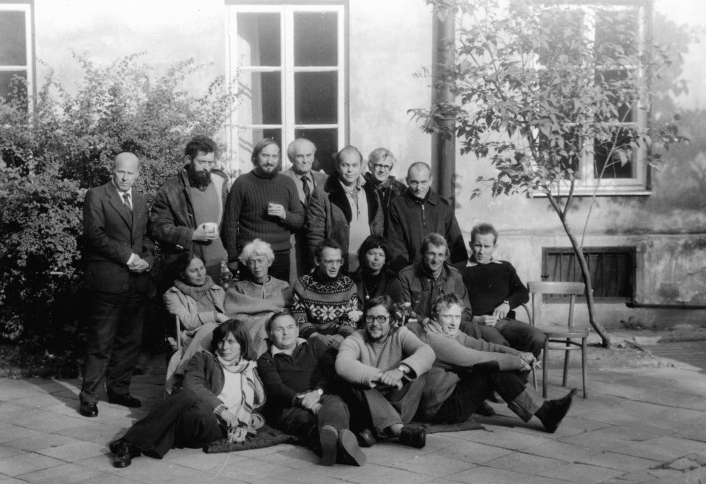 Organizers of the so-called Flying University in 1979 (standing: Kazimierz Janusz, Kazimierz Wóycicki, Antoni Macierewicz, Prof. Jan Kielanowski, Jacek Kuroń, Jan Józef Lipski, priest Stanisław Małkowski; seated in the middle: Joanna Gwiazda, Halina Mikołajska, Jan Lityński, Anka Kowalska, Jacek Bierezin, Andrzej Czuma; seated at the bottom: Konrad Bieliński, Jerzy Markuszewski, Mariusz Wilk, Adam Michnik.  Source: Archive of Ośrodek KARTA, photo by Janusz Krzyżewski