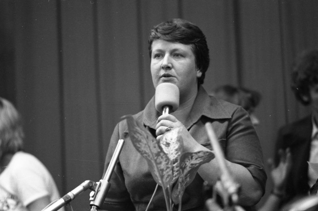 Henryka Krzywonos speaks during the strike at the Gdańsk shipyard in August 1980.  Source: Archiv of Ośrodek KARTA, photo by Witold Górka