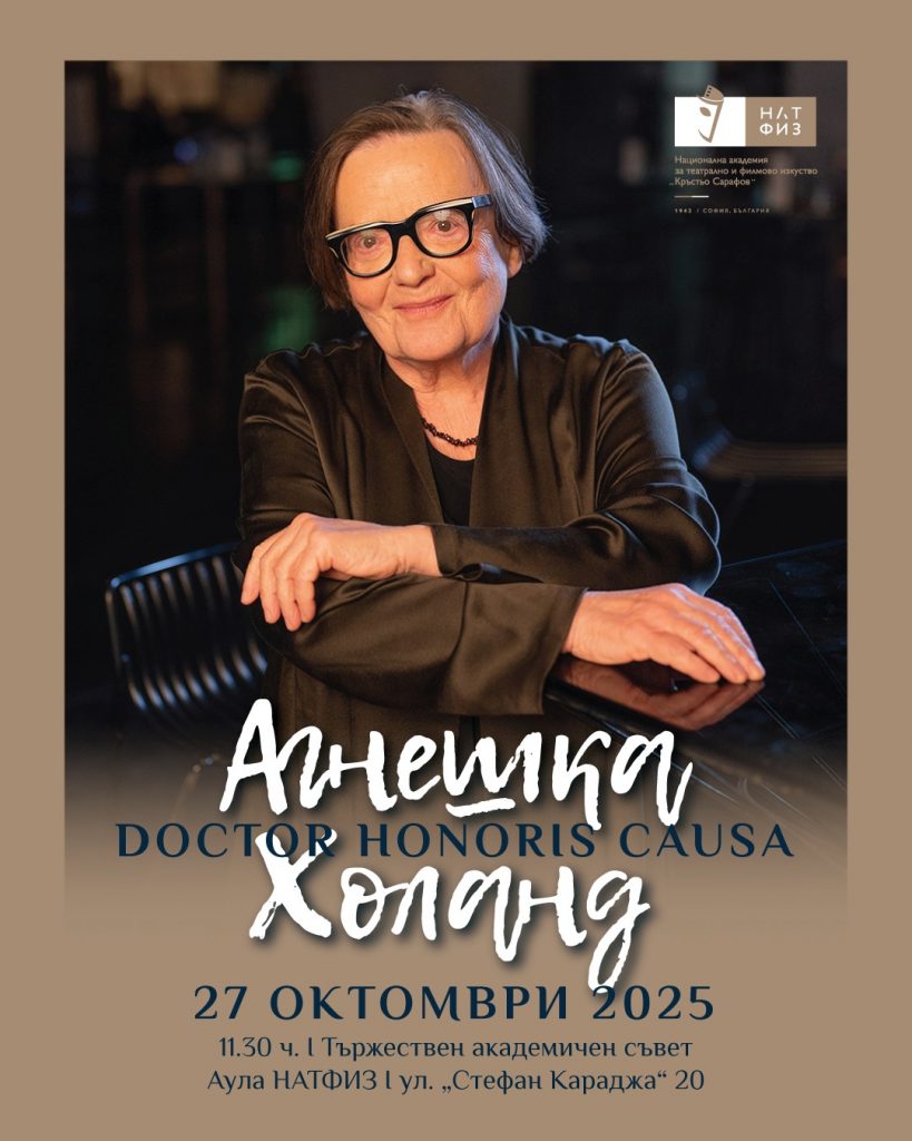 На 27 октомври от 11:30 ч. в Аулата на НАТФИЗ „Кръстьо Сарафов“ ще се състои тържествен академичен съвет, на който световноизвестната режисьорка и сценаристка Агнешка Холанд ще бъде удостоена с почетната титла Doctor honoris causa.