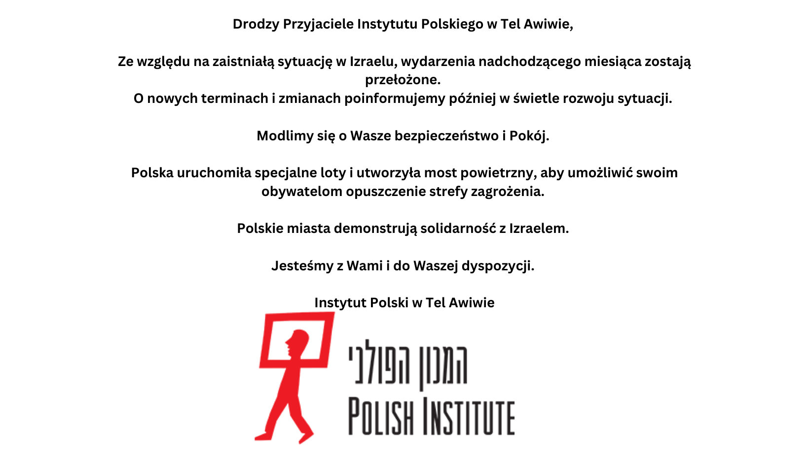 Ze względu na zaistniałą sytuację w Izraelu, wydarzenia nadchodzącego miesiąca zostają przełożone.