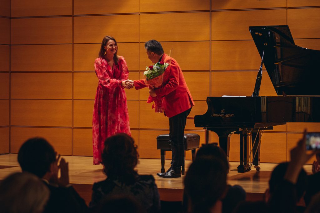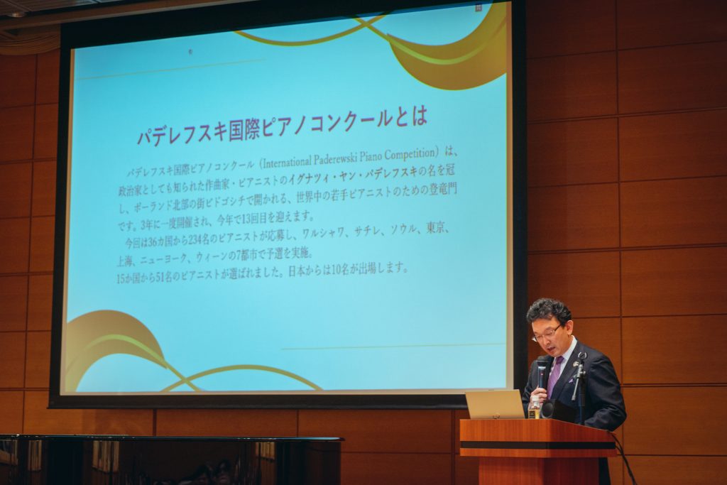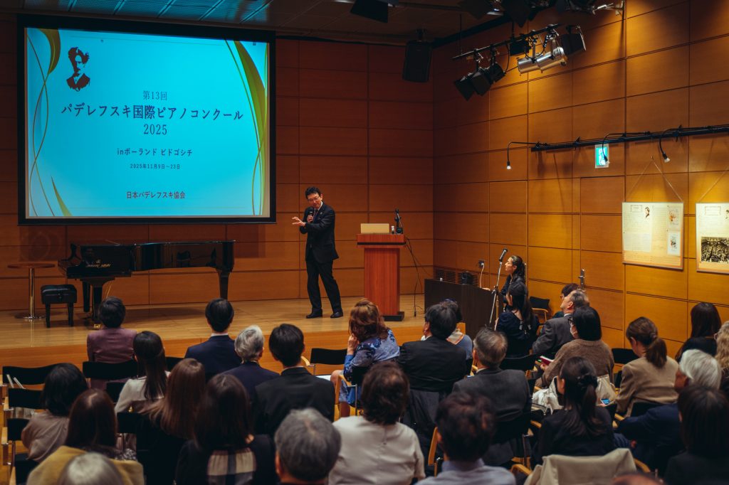 さらに、本イベントでは、2025年11月9日~23日にポーランド・ビドゴシュチュにて開催の第13回パデレフスキ国際ピアノコンクールに関する紹介も行われました。本コンクールの経歴や2026年3月に日本で開催予定の本年のコンクール優勝者リサイタルについてジャパン・アーツ代表取締役社長 二瓶純一氏にお話しいただきました。日本パデレフスキ協会およびポーランド広報文化センターの共同賞として、ポーランド広報文化センターにて記者会見が行われたのち、2026年3月17日~22日に東京、浜松、洲本、茨城にて本年のコンクール優勝者の演奏会が開催されます。1965年の第7回フリデリク・ショパン国際ピアノコンクール第4位入賞者である日本を代表するピアニスト中村紘子(1944年~2016年)を称え、この賞は中村紘子賞と命名されています。