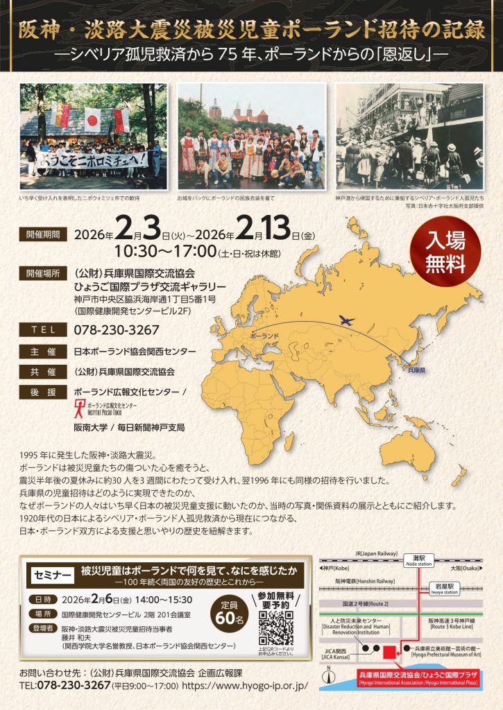 ■セミナー「被災児童はポーランドで何を見て、なにを感じたか ―100年続く両国の友好の歴史とこれから―」 日時:2026年2月6日(金)14:00~15:30 会場:国際健康開発センタービル2階 201会議室 登壇者:阪神・淡路大震災被災児童招待当事者、藤井 和夫(関西学院大学名誉教授、日本ポーランド協会関西センター) ※要予約:申込フォーム( https://forms.gle/ZVvky5GNFe5cjsYW6 ) |