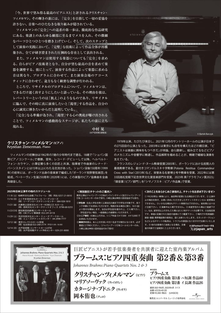 1975年の第9回ショパン国際ピアノコンクールで優勝を果たし、以降「世界で望み得る最高のピアニスト」と評されるクリスチャン・ツィメルマンの2年ぶり待望の日本ツアー。プログラムはリサイタルの直前に自身の「渇望」にしたがって決められる。「プレリュード(前奏曲)」と、同様の性格をもつ作品の組み合わせがコンサート当日発表され、一期一会のプログラムとして演奏される。
