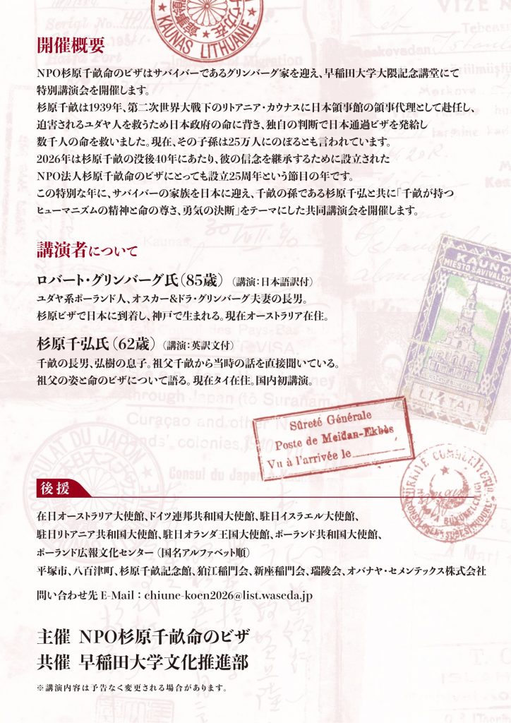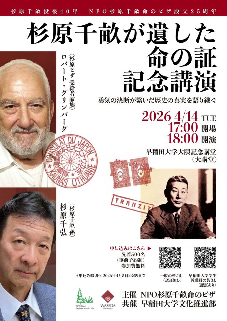 NPO法人杉原千畝命のビザが、千畝没後40年およびNPO設立25周年を記念し早稲田大学にて特別講演会を開催。「命のビザ」発給から85年。今や25万人にのぼるという受給者家族の「今」を、サバイバーのご家族と千畝の孫・千弘氏が共に語ります。現代における人道主義の精神と命の尊さを皆さまと共に考える貴重な機会です。