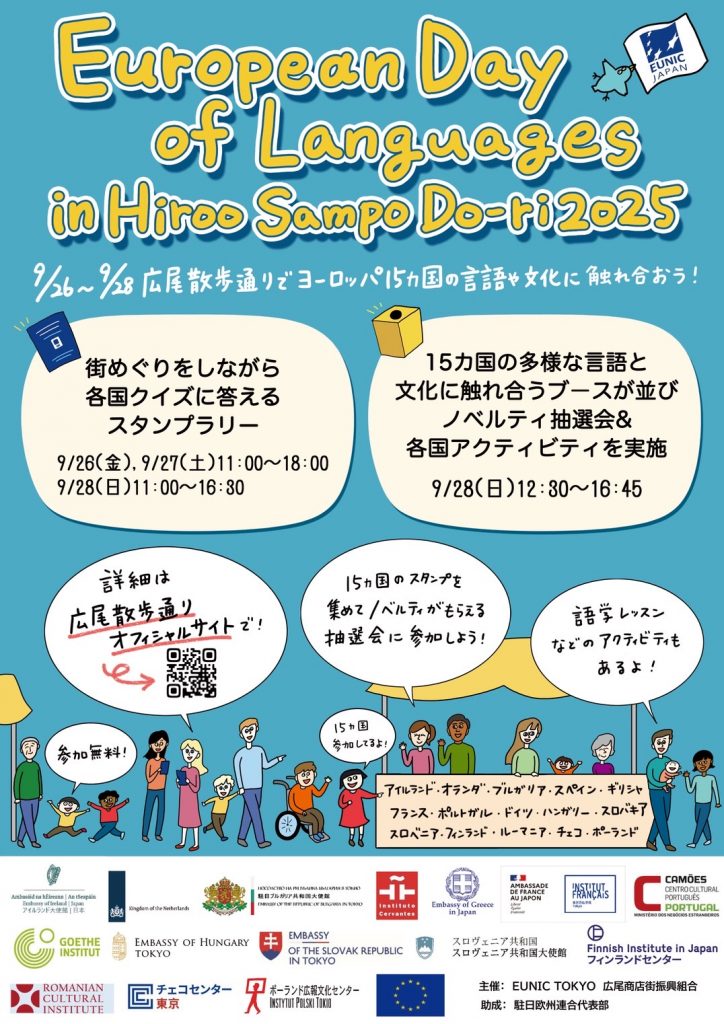 W dniach 26 – 28 września Instytut Polski w Tokio wraz z EUNIC Tokyo i Stowarzyszeniem Hiroo Shopping Street Promotion, jak co roku, zaprasza wszystkich do wspólnego świętowania Europejskiego Dnia Języków. W tegorocznym wydarzeniu bierze udział 15 krajów Unii Europejskiej!