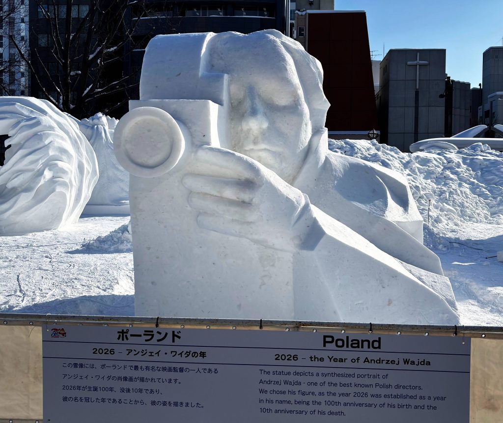 ポーランド代表チームは「2026—アンジェイ・ワイダの年」と題した作品を制作しました。雪像には、ポーランドの映画監督アンジェイ・ワイダが手にカメラを持った様子が表され、2026年が同監督生誕100年、没後10年であり、彼の名を冠した年であることから描かれました。