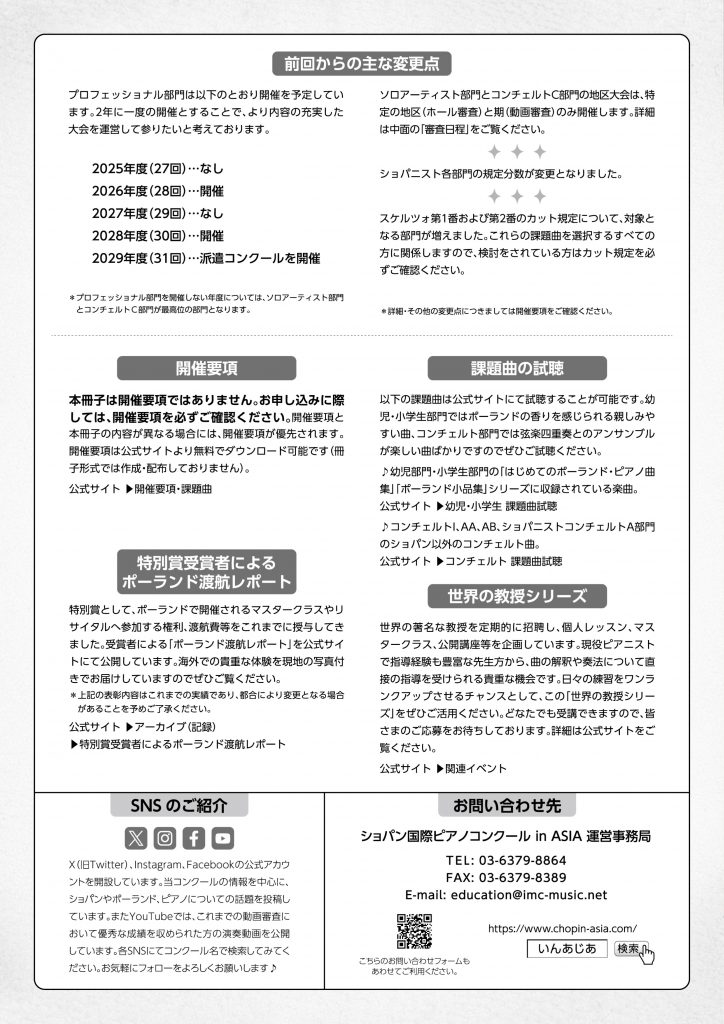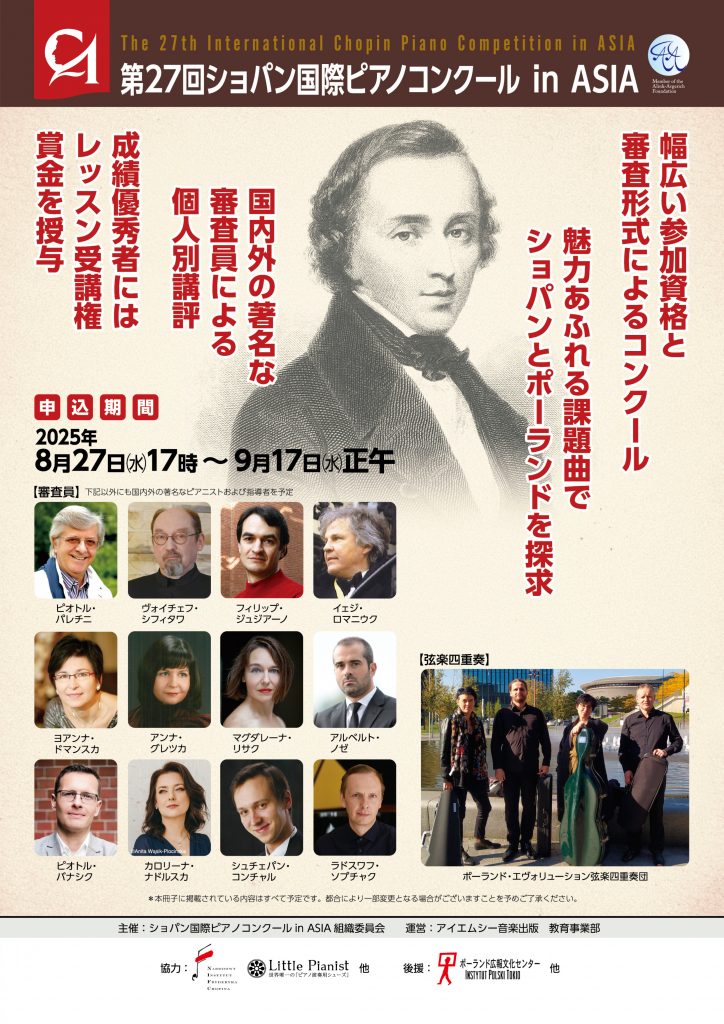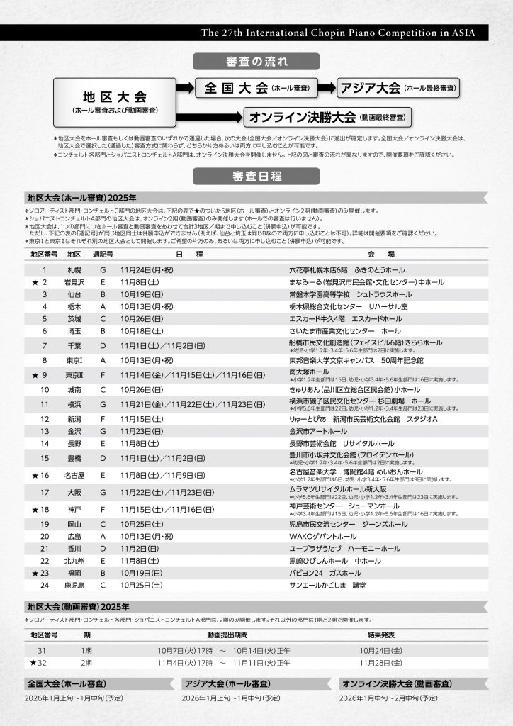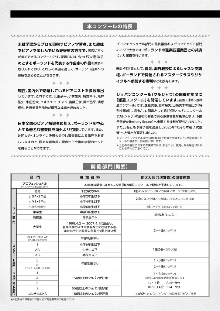 未就学児からプロを目指すピアノ学習者、愛好家の方まで、幅広い方々が参加できるコンクール。課題曲にはショパンをはじめとするポーランドを代表する作曲家の作品を取り入れている。審査員も日本のピアノ指導者に加え、ポーランドを中心とする海外からも多く招聘。