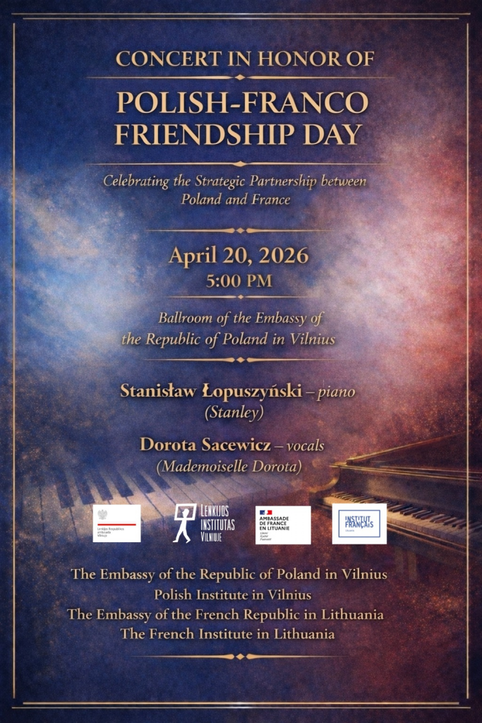Z okazji ustanowionego Traktatem z Nancy z dnia 9 maja 2025 r. Dnia Przyjaźni Polsko-Francuskiej, Instytut Polski na Litwie, Ambasada Rzeczypospolitej Polskiej w Wilnie, Instytut Francuski na Litwie oraz Ambasada Francji na Litwie mają zaszczyt zaprosić na koncert z okazji tego święta.