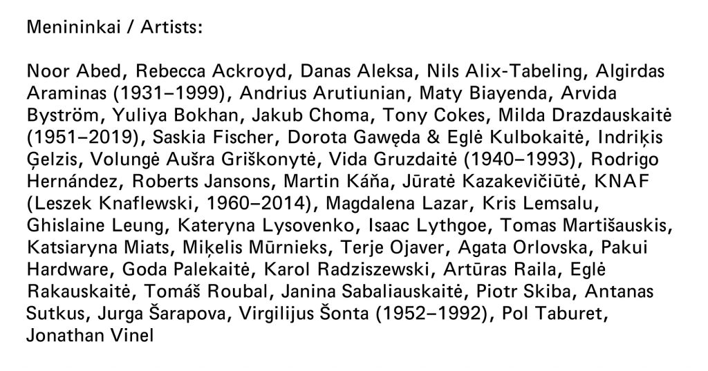 W obliczu rosnącej polaryzacji i fragmentacji świata (oraz naszego społeczeństwa) wystawa dąży do stworzenia warunków do bardziej otwartej debaty na temat zmieniającej się relacji między sztuką współczesną a jej odbiorcami w obliczu wielowymiarowych kryzysów. Jednym z głównych punktów odniesienia wystawy jest fragment filmu „Kai aš mažas buvau” (1968) w reż. Algirdasa Araminsa. Przedstawia on wycieczkę szkolną na jedną z pierwszych wystaw w ówczesnym Pałacu Wystawowym Sztuki w Wilnie (obecnie ŠMC). Film podkreśla niełatwą relację widza z nowoczesnością: prowincjonalny bohater, grany przez aktora Broniusa Babkauskasa, uderza w wielkie okna gmachu – symbol modernistycznej przejrzystości. Wysoką kulturę reprezentują tu modernistyczna wystawa i manieryczny głos przewodniczki, podczas gdy wychowawca klasy pełni rolę dyscyplinarną. Ta presja zbliża do siebie parę uczniów: uciekają z oprowadzania i nawiązują relację o charakterze romantycznym.