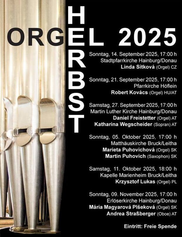 Das Projekt „Orgelherbst“ soll die beiden Städte Bruck an der Leitha und Hainburg an der Donau durch Orgelmusik verbinden. Der Zyklus besteht aus sechs Orgelkonzerten (drei Konzerte in Bruck und drei Konzerte in Hainburg), die von in- und ausländischen Konzertorganist:innen vorgetragen werden. Dem Publikum wird damit die Möglichkeit geboten, künstlerisch anspruchsvolle Interpretationen von verschiedenen Künstlern zu hören. So werden die Orgeln in Bruck und in Hainburg auf höchstem Interpretationsniveau erklingen.