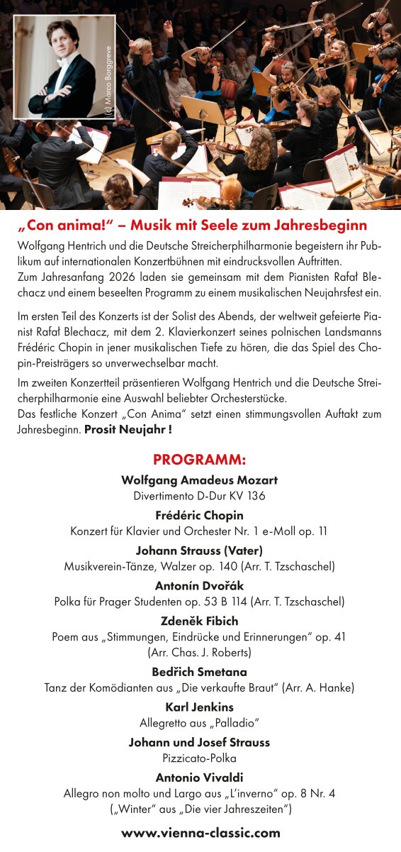 Blechacz gilt heute als einer der führenden Chopin-Interpreten weltweit. Er tritt regelmäßig in den großen Konzertsälen Europas, Nordamerikas und Asiens auf – seine internationale Präsenz unterstreicht die universelle Kraft seiner Interpretationen. Sein Spiel vereint technische Präzision mit tiefgründiger Musikalität und berührt durch außergewöhnliche Ausdruckskraft. In seinen Konzerten stellt er Chopins Musik oft in einen dramaturgischen Kontext mit Werken von Beethoven oder Schubert – stets mit dem Ziel, Chopins Poesie in ihrer Tiefe und Vielschichtigkeit erlebbar zu machen.Mit Werken von Chopin, Beethoven und Schubert entfaltet sich ein musikalischer Dialog zwischen Romantik und Klassik – getragen von Rafał Blechacz’ unverwechselbarer Klangsprache.